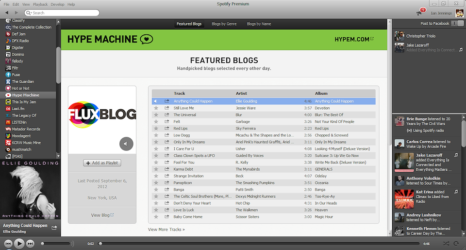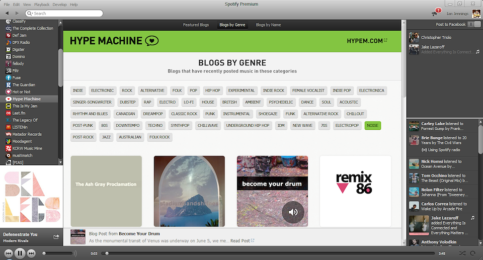 blog.hypem.com/2012/09/hype-machine-on-spotify/At one time Spotify added support for extensions. I designed and built the Hype Machine Spotify integration.