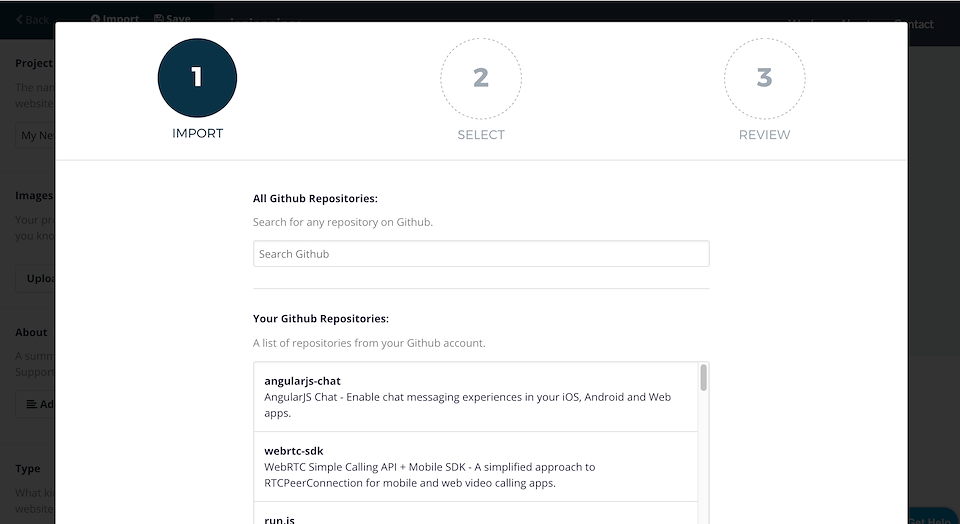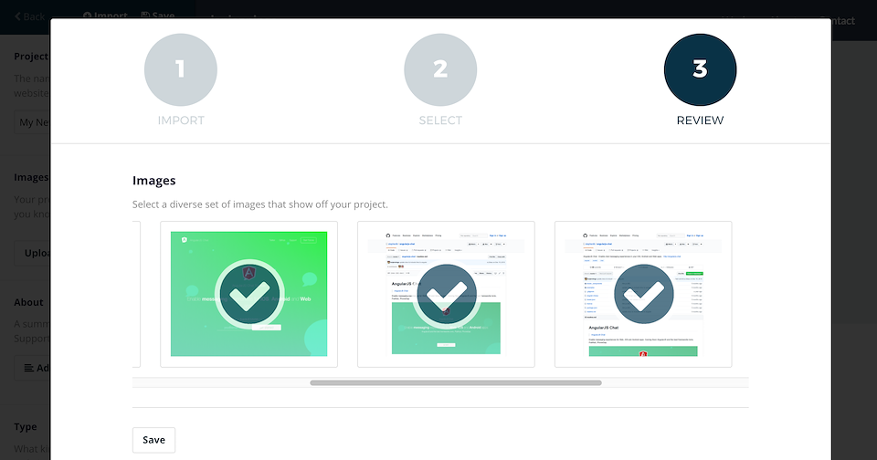 Import your work from places it already exists online. Supports GitHub, iTunes App Store, Websites, and bulk image uploads.