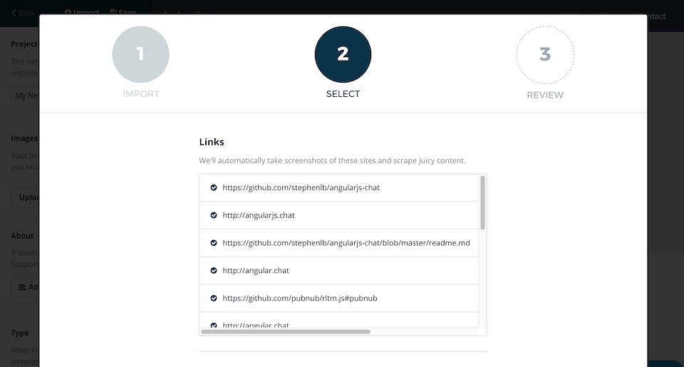 Example of importing project to portfolio. Step 2 – Select the links you’d like to parse.