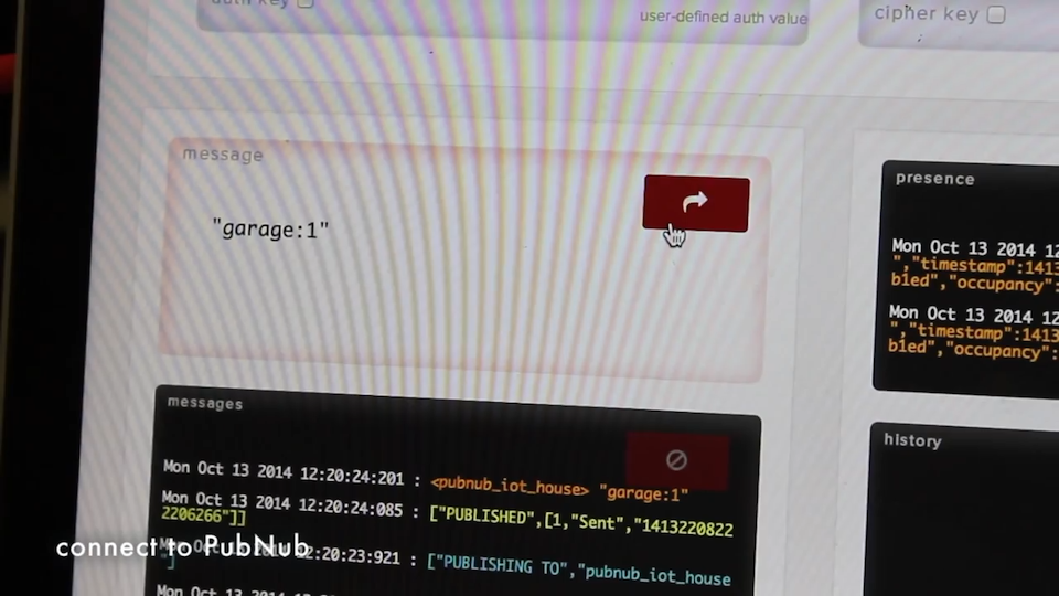 When the model house connects to the internet, it opens a connection to PubNub and begins waiting for messages. When someone taps “Open Garage” on their phone, their phone signals PubNub and PubNub tells the house to open the garage door.