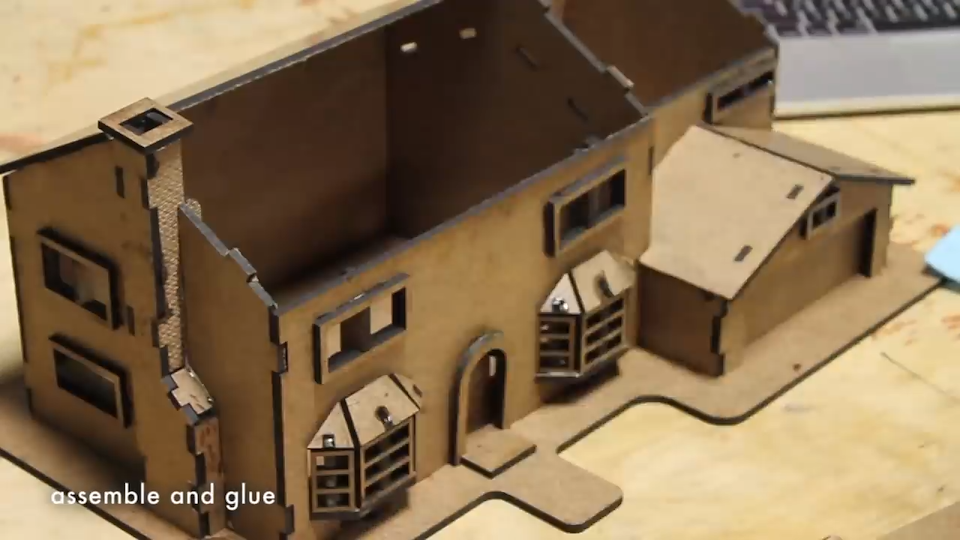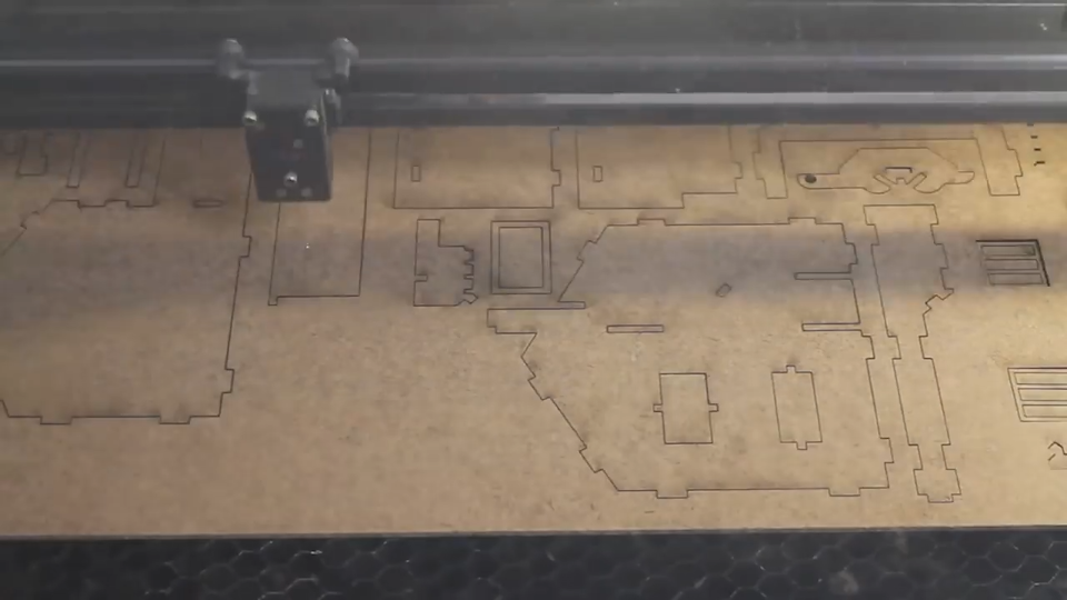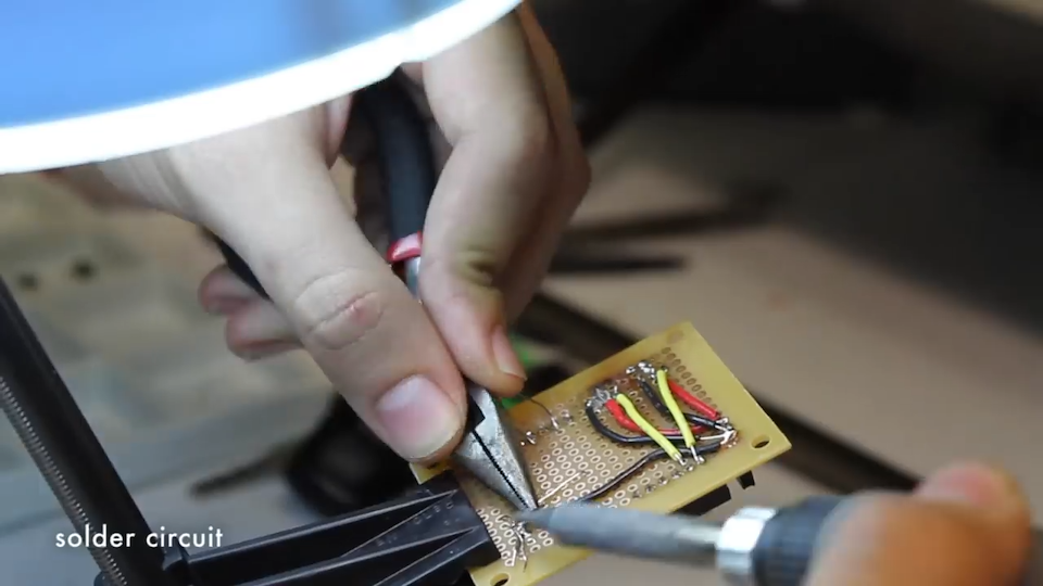 The model house was cut by laser and then modified with power tools to facilitate four lights and two servos. A prototype circuit board was soldered to provide resistance to the LEDs, supply external power to the servos, and provide a common ground.